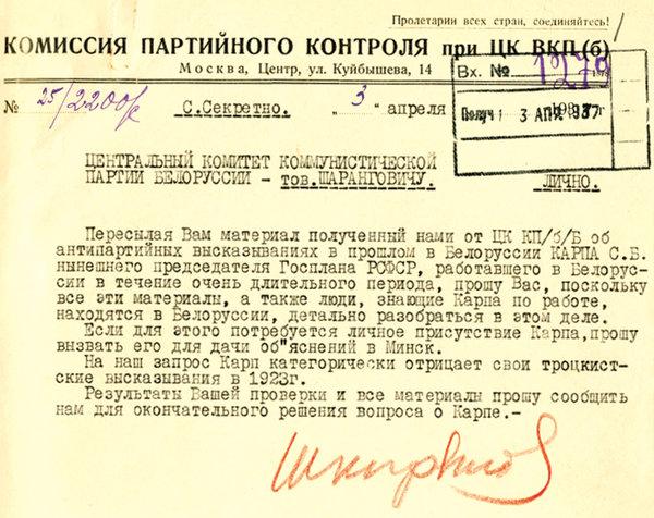 Одна из многочисленных секретных записок Шкирятова